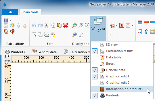 Il layout delle finestre può essere aggiustato tramite la scelte delle finestre attive e la loro ubicazione in luogo qualsiasi. Il pacchetto InstalSystem 5 è compatibile con il lavoro su due monitor. Si raccomanda il lavoro in tale configurazione hardware. La scelta delle finestre viene fatta nell'ambito della lista accessibile sulla barra degli strumenti.